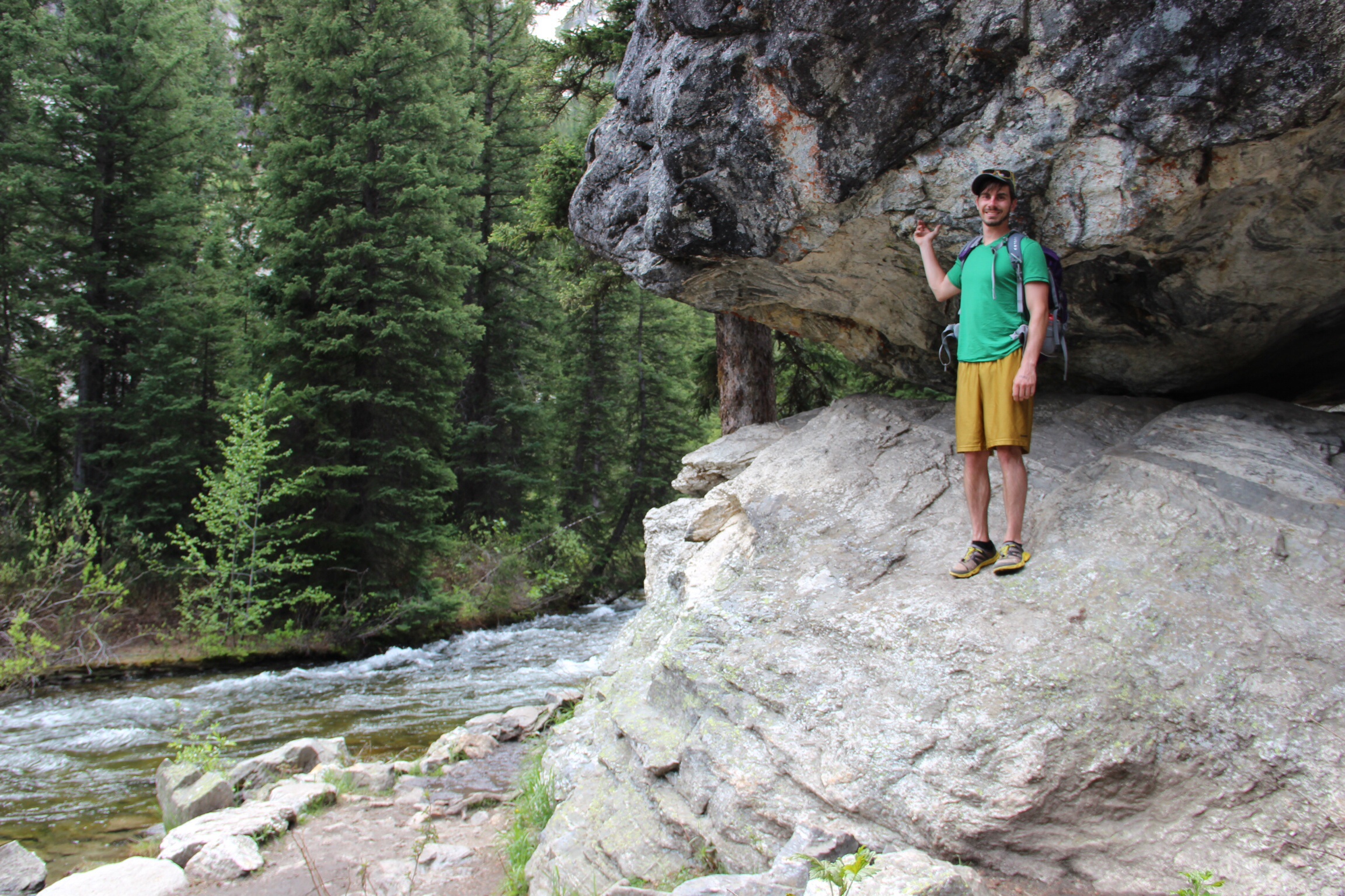 Our final full day in The Tetons we set out to complete a hike I had done once before with my dad. The hike was called Cascade Canyon and it was beautiful, although different than before. Athena and I were hiking it earlier in the year than my dad and I did, so the the stream which runs parallel to the path was both higher and faster. There was still some residual snow which we crossed more than a few times during the day. This area is prime moose country and we saw a big bull moose who turned out to be pretty good at hiding from a camera lens. Not long after our moose I ventured off the path to examine the stream when I spied something big and dark behind some trees in the distance. We grabbed the binocs and scanned the hill opposite us until finally a black bear emerged! It was really cool to observe this bear from a distance as he meandered along munching on shrubs, especially because we had found him ourselves rather than by following a cluster of people as so often happens. In addition to the bear and the moose we saw many yellow bellied marmots who always seemed curious of our movements in their territory. The canyon afforded constant views of peaks on both sides of us, and the hike was challenging but nit overwhelming. There was a near constant supply of waterfalls gushing down the sides of the peaks on our left and right all day. If we had more time it would have been cool to stray from the path for a closer view and some better pictures. I guess well have to save that for next time. In my opinion, this is one of the top hikes in GT, if not the best. Great views and wildlife, and I really enjoyed getting to retrace my steps from the hike with my dad years earlier.